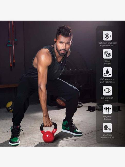 Say goodbye to noise from the outside world and plug into your musical serenity with boAt Rockerz 235V2 T. The latest Bluetooth v5.0 in boAt Rockerz 235V2 T offers a seamless wireless experience while you listen to your music. Now you don't have to wait for long while the headsets get charged as it also comes with Fast Charging technology. The IPX5 sweat and water resistance offers a shield to your headset, whether you sweat it out at the gym or get indulged in adrenaline pumping action. With a playtime of up to 8 hours, remain plugged in to fun, life and energy to your boAt Rockerz 235V2 T